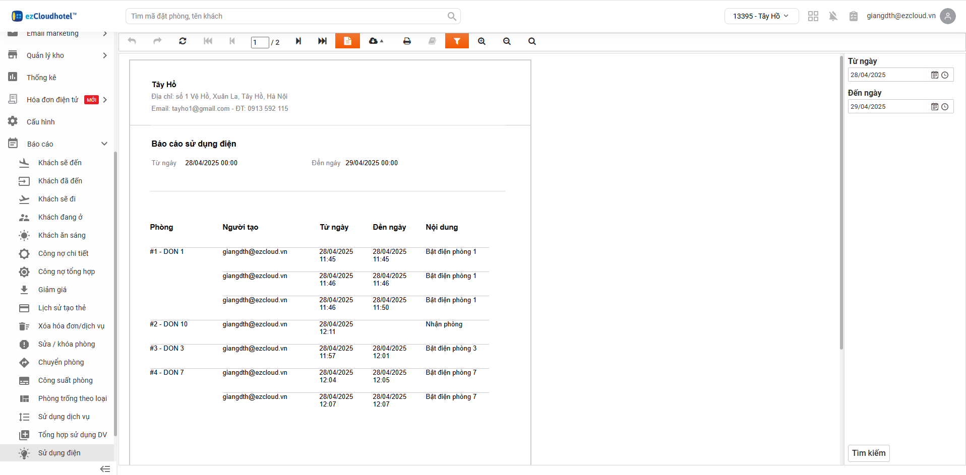 - Bước 1: Truy cập vào hệ thống ezCloud >> Báo cáo >> Chọn báo cáo Sử dụng điện