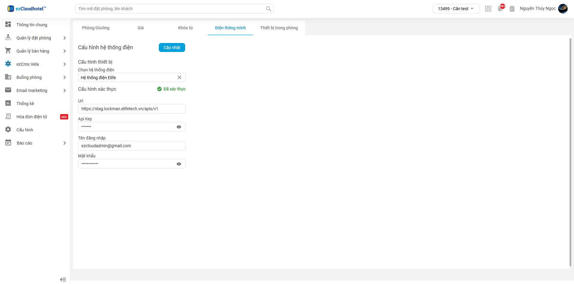 • Vào Cấu hình >> Chọn Phòng & Giá >> Chọn Điện thông minh >> Chọn Loại Hệ thống điện Elife >> Nhập thông tin kết nối do phía NCC cung cấp