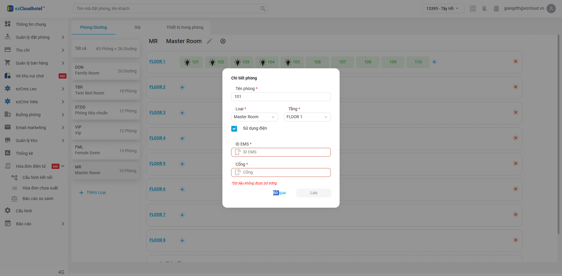 - Mục đích: Cho phép người dùng thao tác Bật/Tắt điện tại phòng đã được cấu hình “Sử dụng điện”