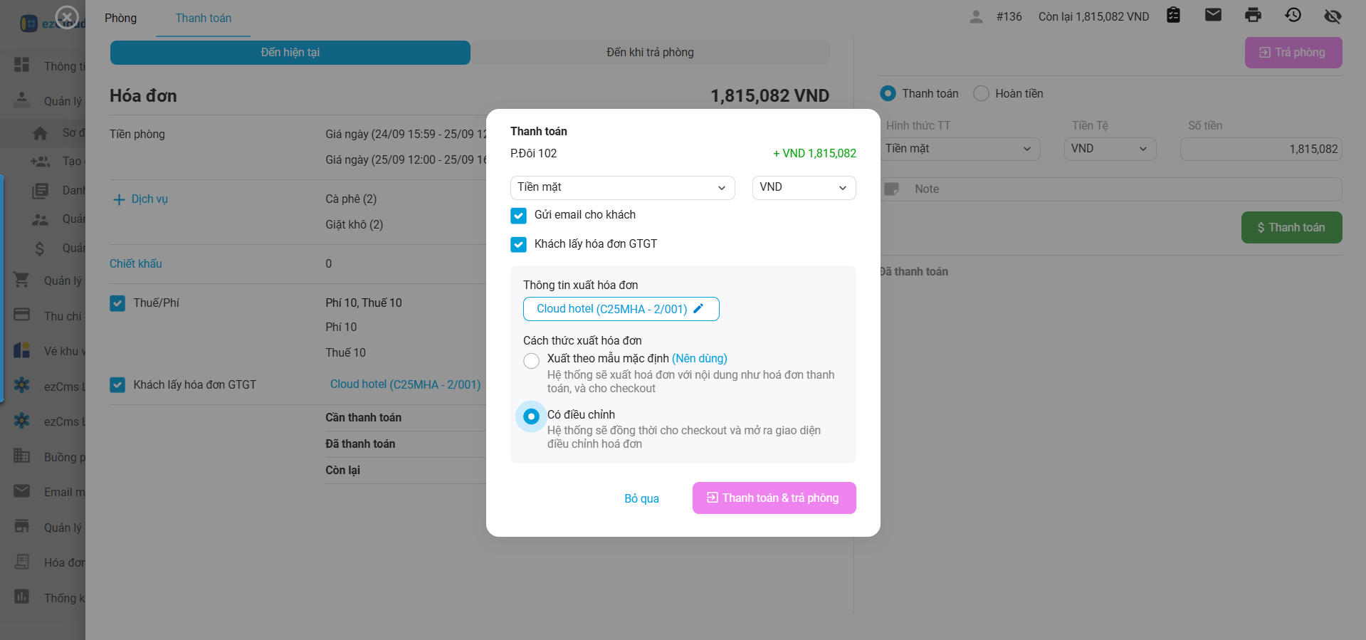 - B2: Nhấn Trả phòng >> Chọn phương thức “Có điều chỉnh”