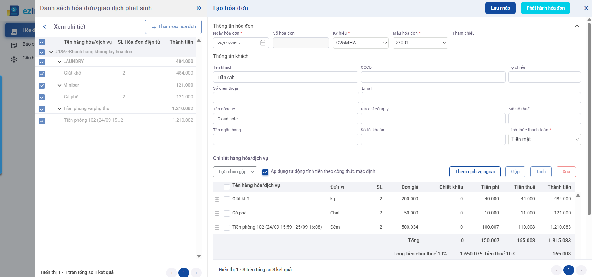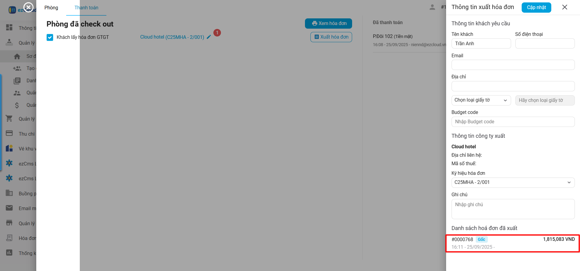 - B4: Tại phần mềm PMS, hệ thống thực hiện thanh toán và trả phòng và tự động mở giao diện xuất hóa đơn trên ezInvoice Admin