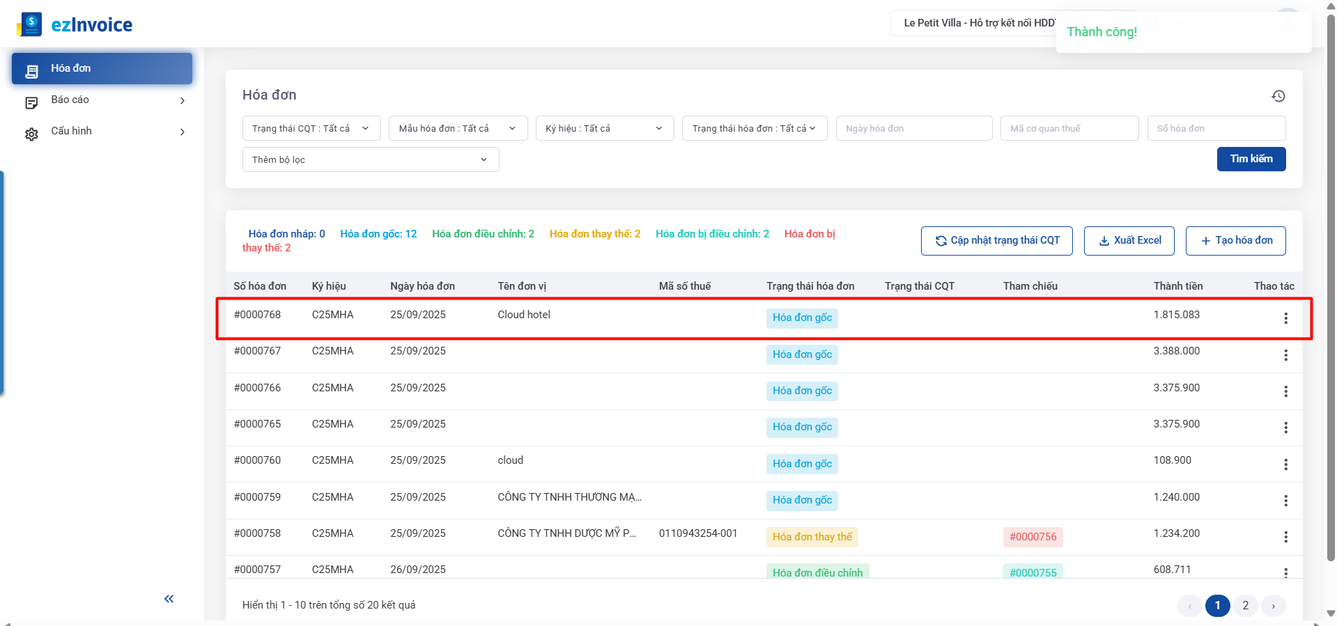 Hình ảnh – Hóa đơn được lưu tại màn Danh sách hóa đơn trên ezInvoice Admin