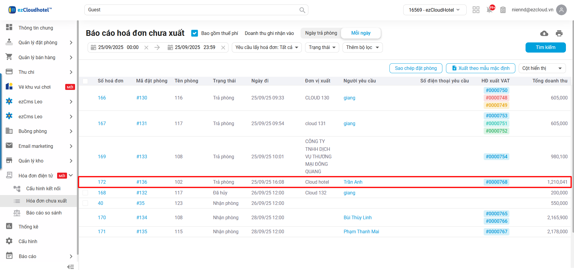 - PMS: màn Chi tiết đặt phòng và Hóa đơn chưa xuất