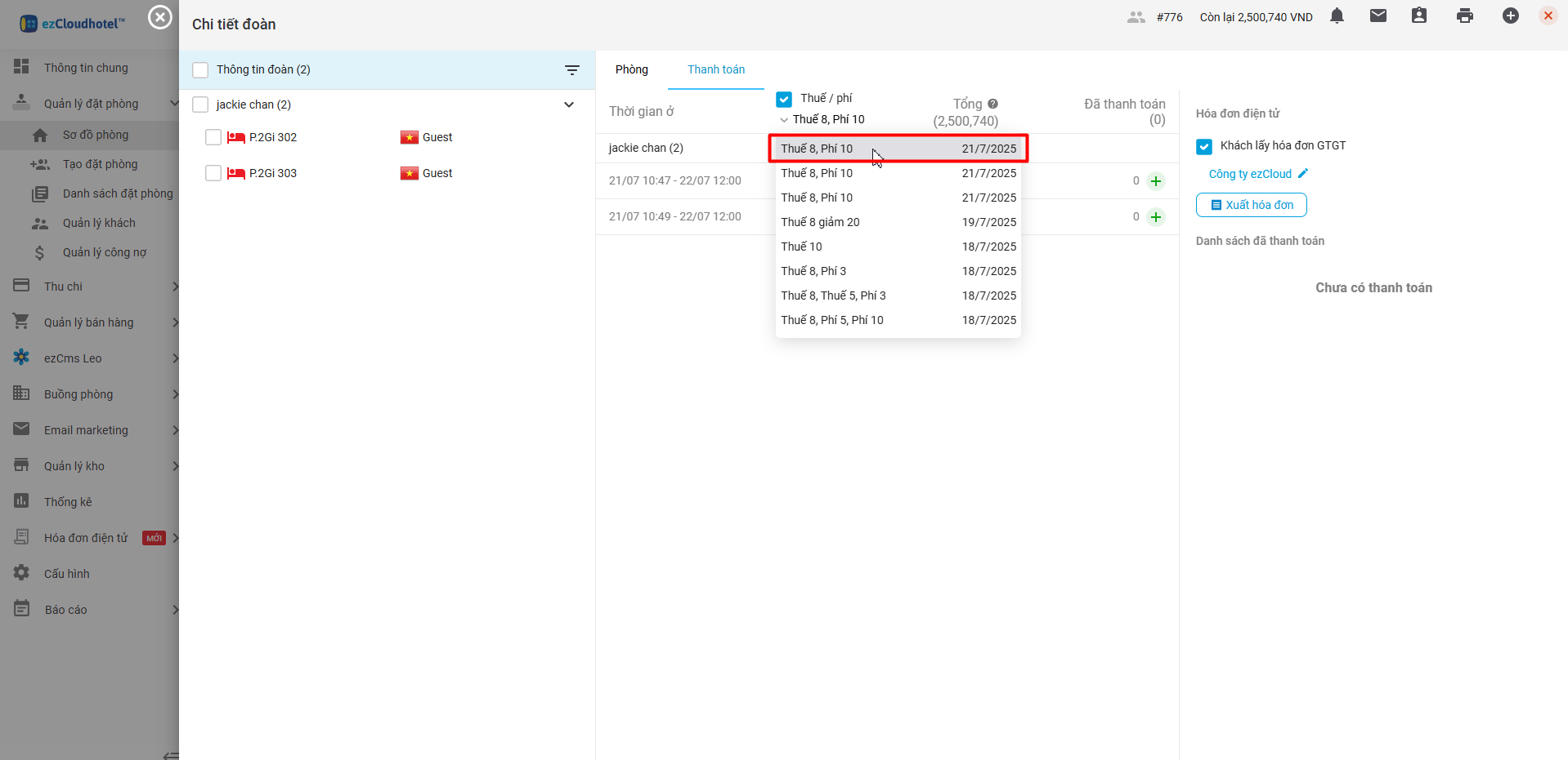 • Chọn version thuế/phí tại màn “Chi tiết đoàn” và “Chi tiết booking thuộc đoàn”