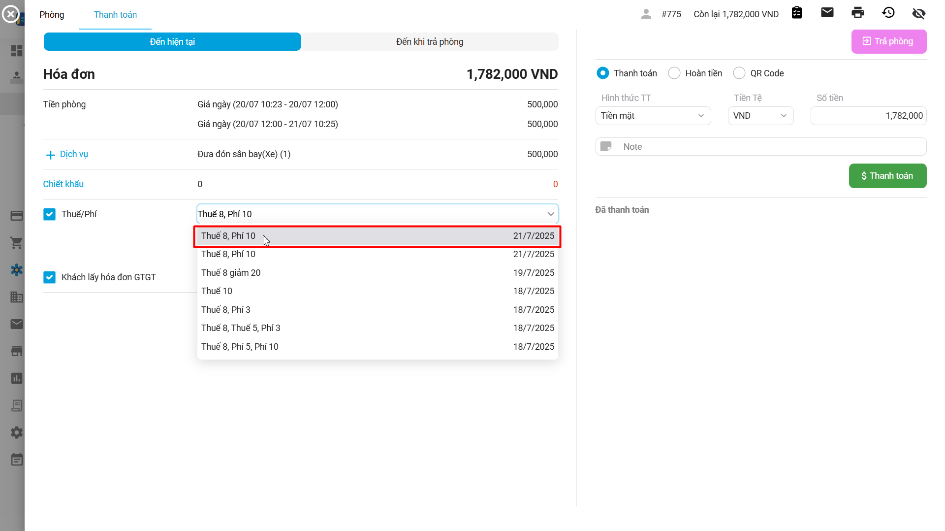 • Tích chọn “Thuế/Phí”: Hiển thị danh sách các version thuế/phí mà người dùng đã cấu hình trong mục “Cấu hình thuế/phí” từ trước đến nay. Sau khi chọn version thuế/phí trong danh sách, tiền phòng và dịch vụ trong booking sẽ được tính theo version thuế/phí đã chọn