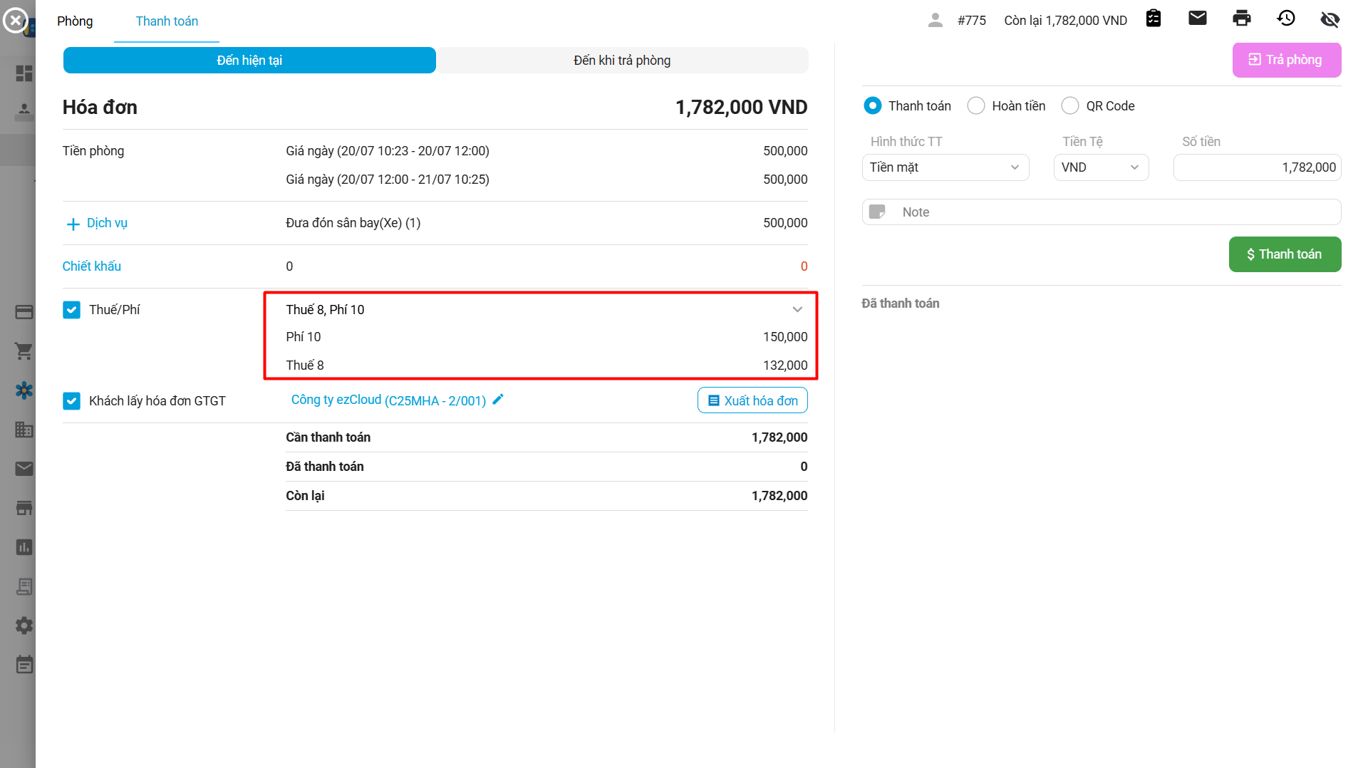 • Bước 2: Tạo đặt phòng >> Tích chọn “Thuế/Phí” >> Chọn version “Phí 10, Thuế 8”