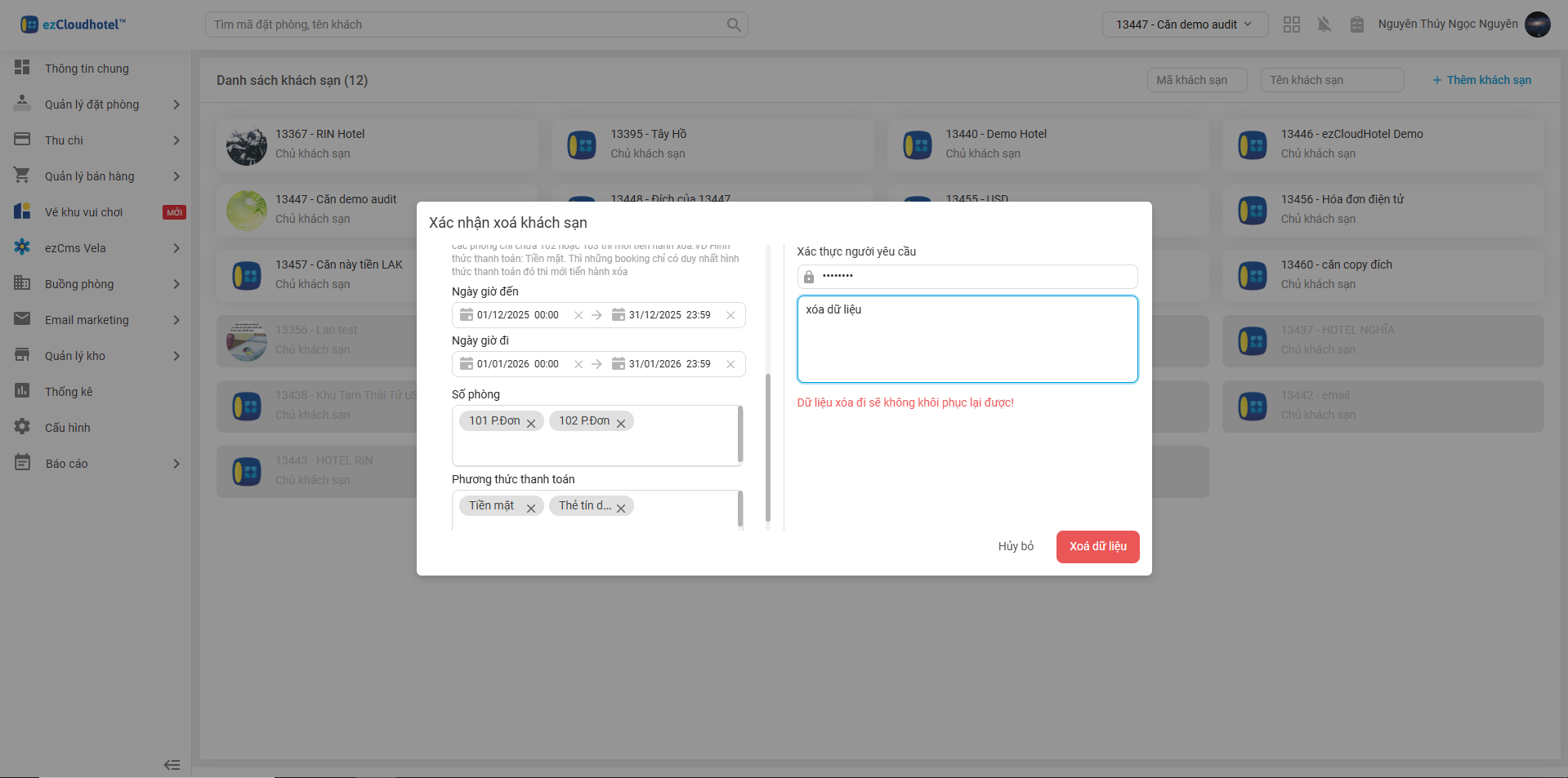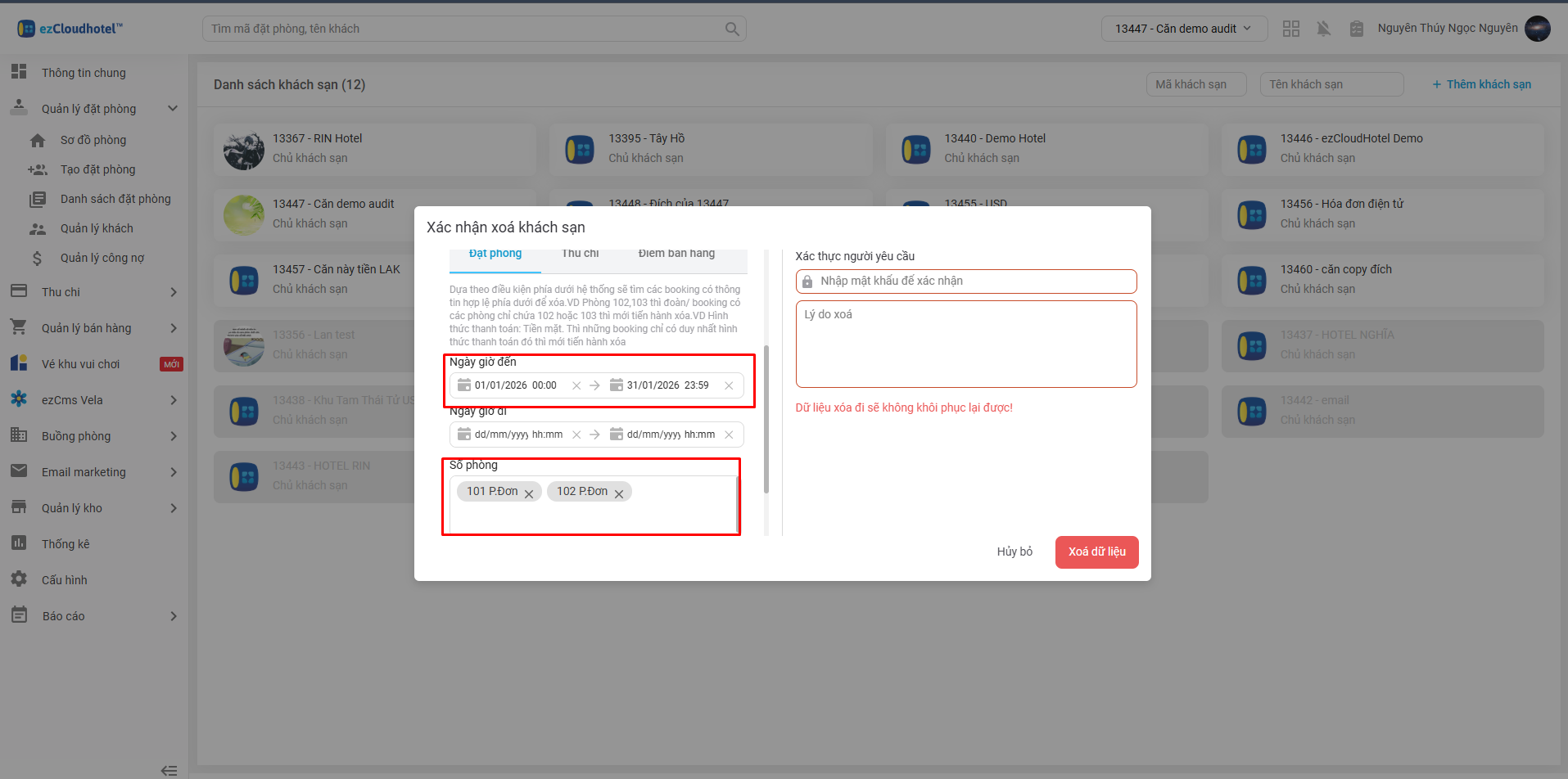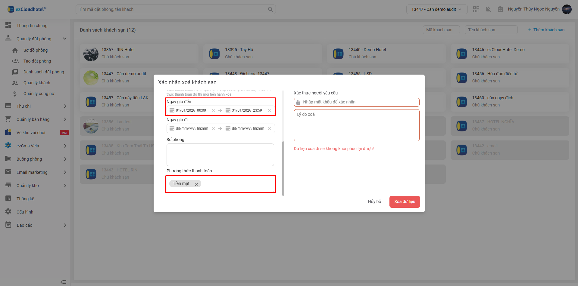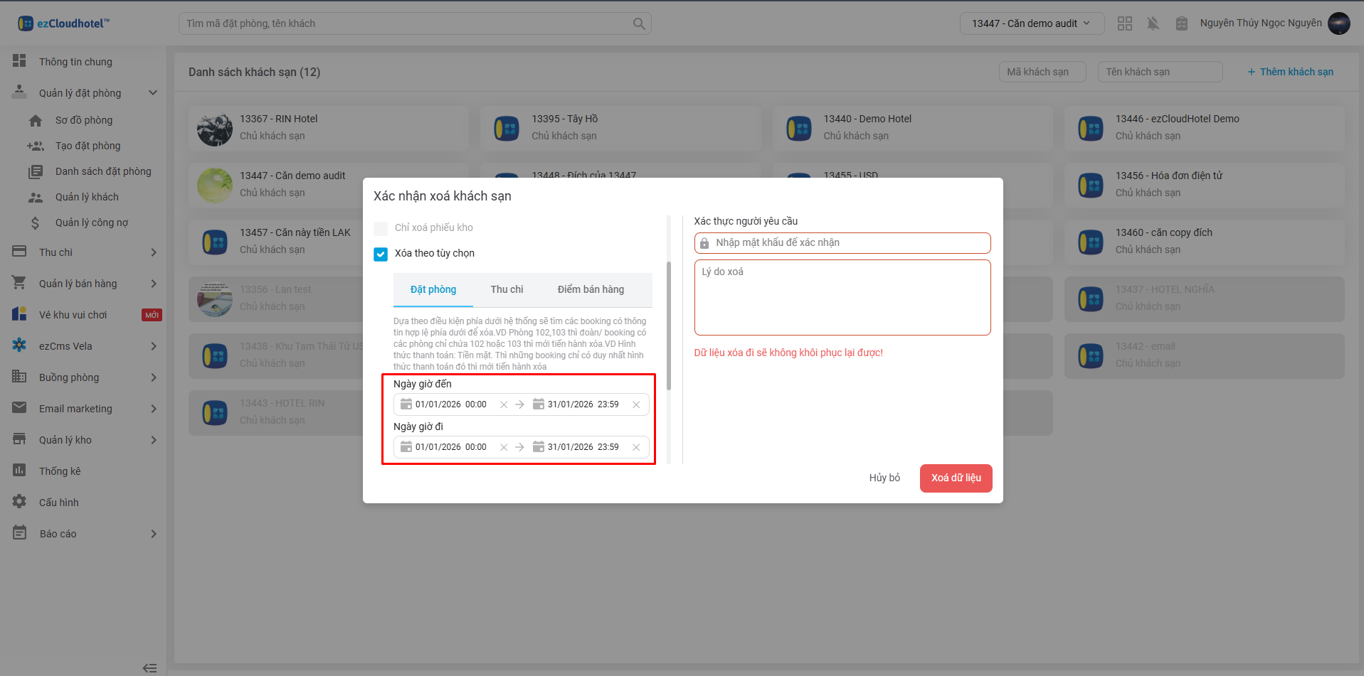 Thao tác: Chủ khách sạn truy cập màn Danh sách khách sạn >> Chọn khách sạn cần xóa dữ liệu >> Click dấu 3 chấm >> Chọn Xóa dữ liệu >> Chọn Xóa theo tùy chọn  >> Chọn khoảng thời gian muốn xóa >> Chọn các mục muốn xóa >> Nhập mật khẩu >> Nhập lí do xóa >> Chọn Xóa dữ liệu