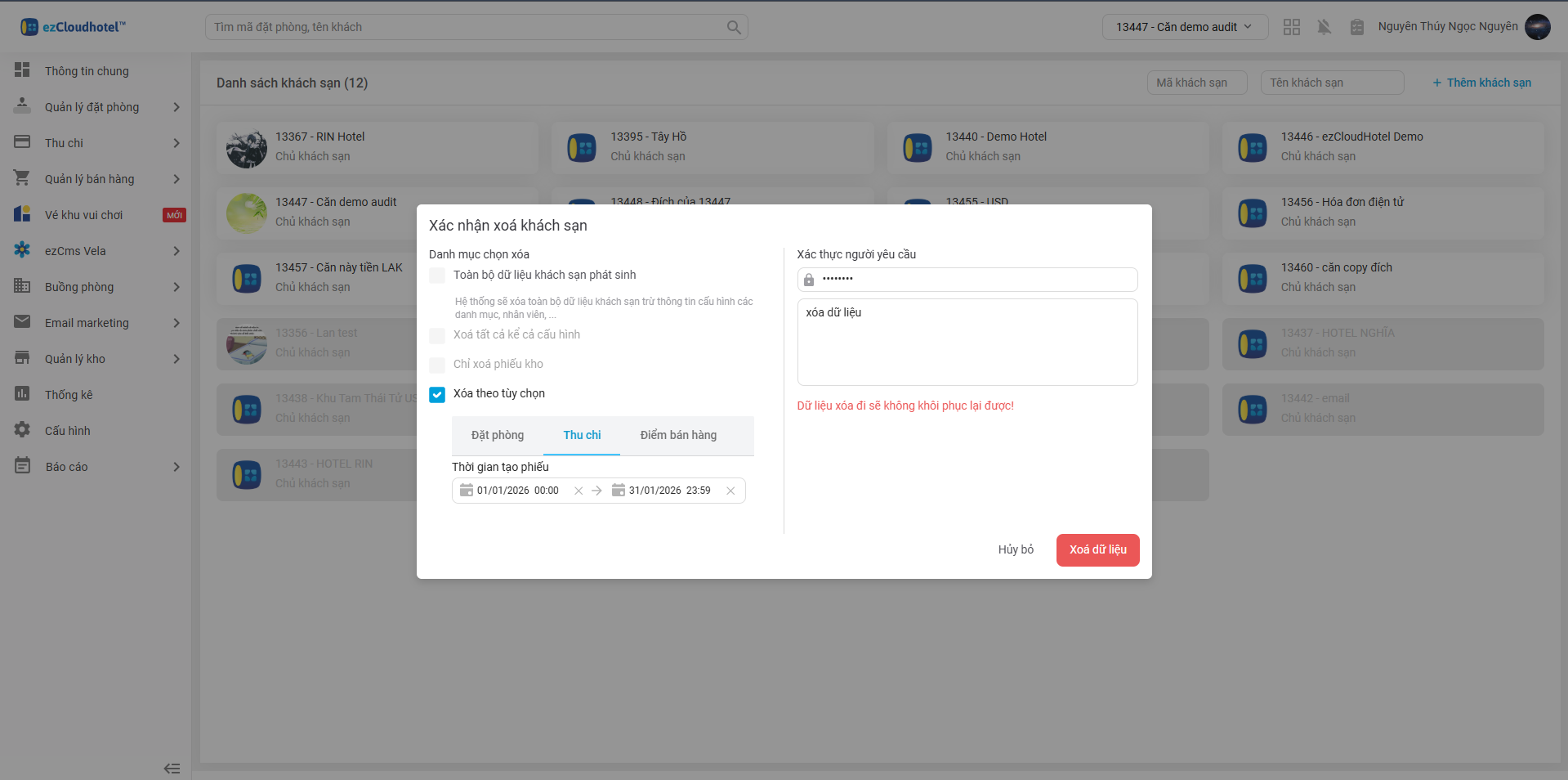 Thao tác: Chủ khách sạn truy cập màn Danh sách khách sạn >> Chọn khách sạn cần xóa dữ liệu >> Click dấu 3 chấm >> Chọn Xóa dữ liệu >> Chọn Xóa theo tùy chọn >> Chọn Thu chi >> Chọn khoảng thời gian muốn xóa >> Nhập mật khẩu >> Nhập lí do xóa >> Chọn Xóa dữ liệu