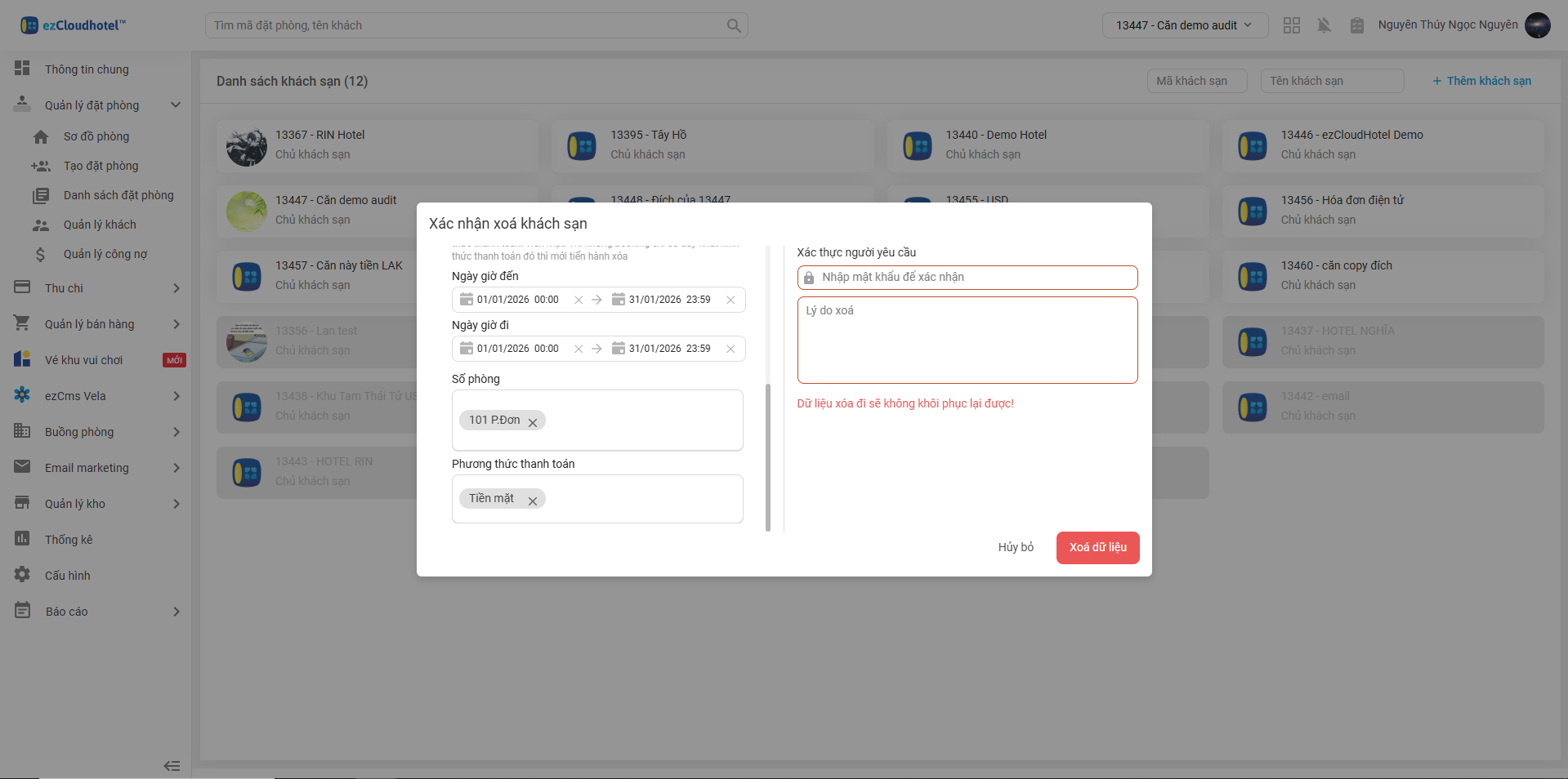 Thao tác: Chủ khách sạn truy cập màn Danh sách khách sạn >> Chọn khách sạn cần xóa dữ liệu >> Click dấu 3 chấm >> Chọn Xóa dữ liệu >> Chọn Xóa theo tùy chọn >> Chọn Đặt phòng >> Chọn các điều kiện về đặt phòng muốn xóa  >> Nhập mật khẩu >> Nhập lí do xóa >> Chọn Xóa dữ liệu